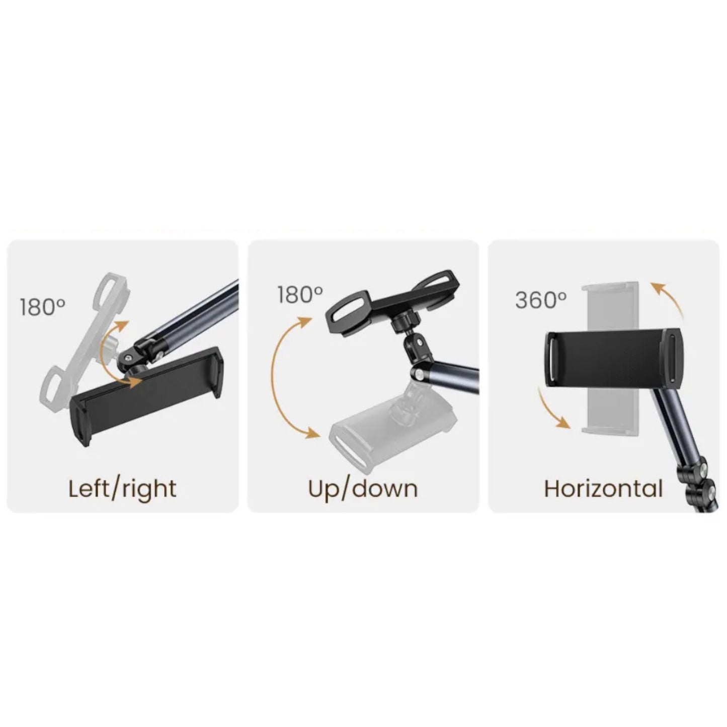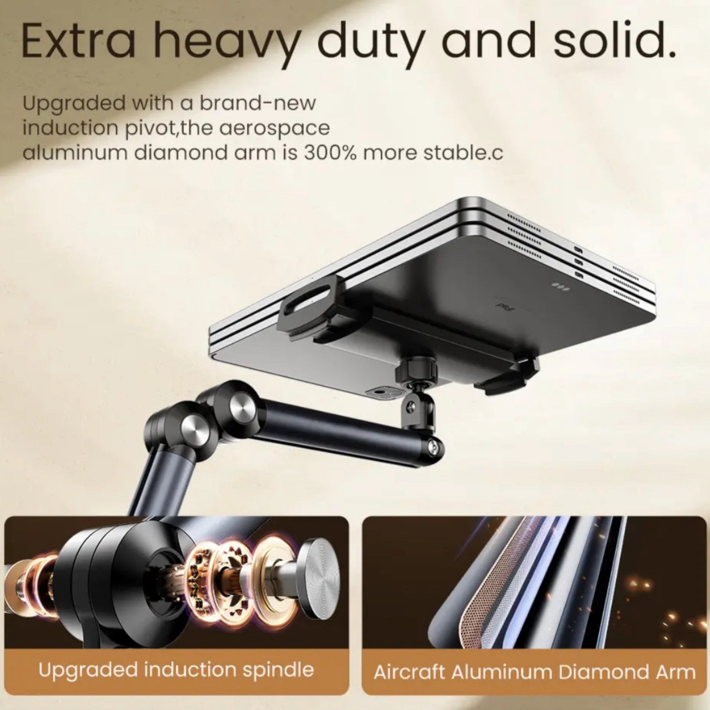 航空機用アルミニウムダイアモンドでできた強靭なアーム部分は簡単に角度や高さ調整でき、タブレットホルダーは360度回転可能。