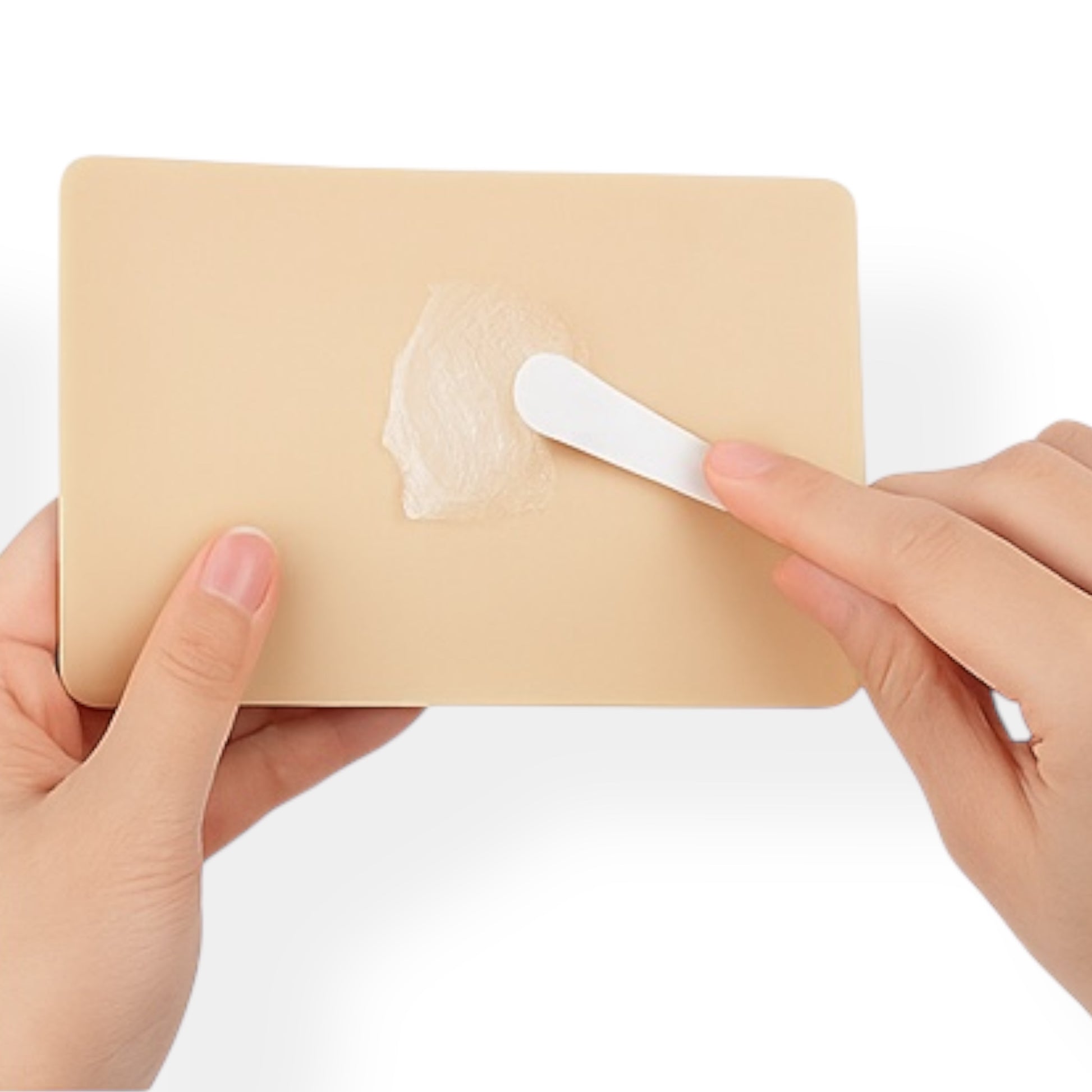 ①スパチュラまたは手袋をした指で適量を取り、練習用スキンまたは布に直接塗布