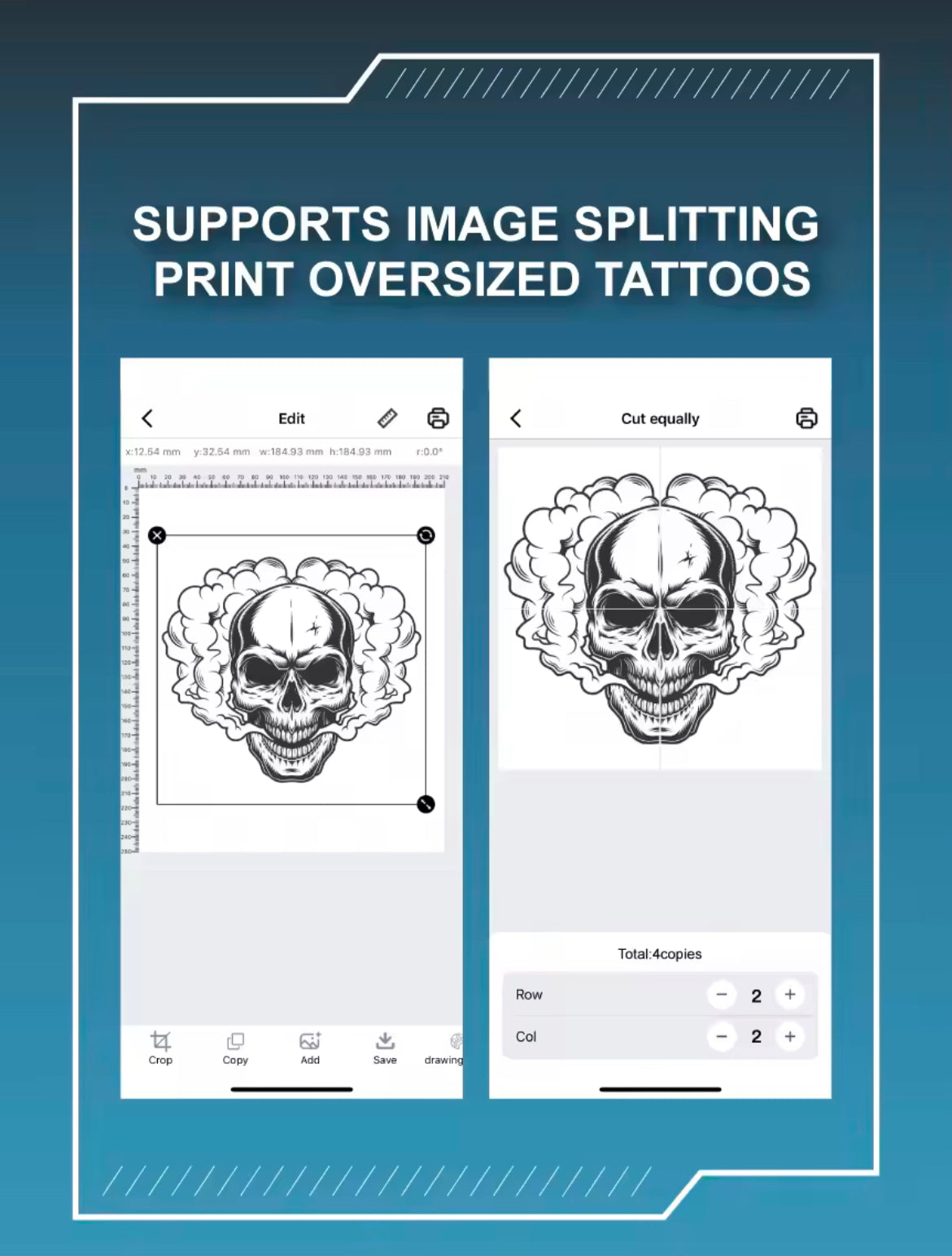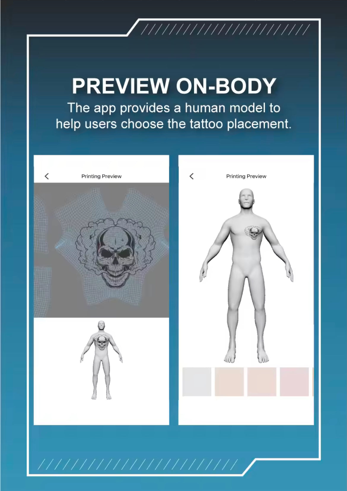 アプリ上でデザインに色をつけてカラリングの参考にしたり、人体モデルにデザインを映し出し位置決めの参考にできます。
