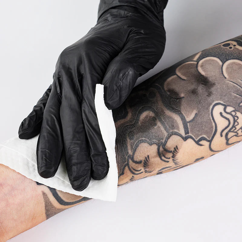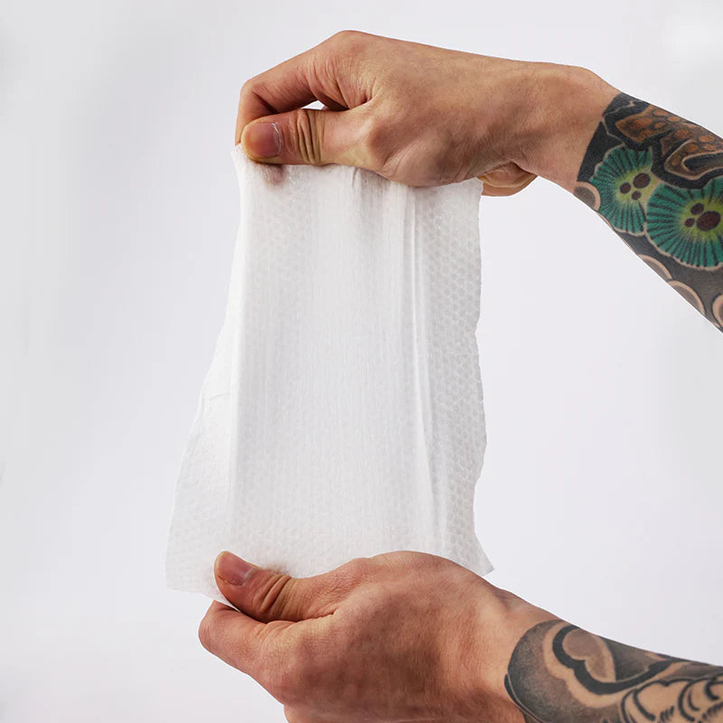 植物性の繊維を使用し、施術中の敏感な肌にも優しいタトゥー用ペーパータオル。